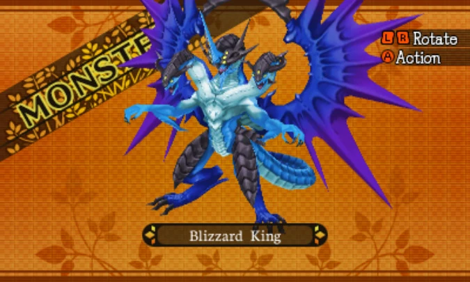 Blizzard King, known as Drake and Hyouran no Shihaisha (氷嵐の支配者, roughly translated as The one ruling over blizzards) in Japan, is a mighty three-headed dragon that is fond of cool habitats. Two of its three-eyed heads sprout from its shoulders and the central head has six eyes. Its lethal freezing breath and natural arsenal can leave the whole party frozen solid.