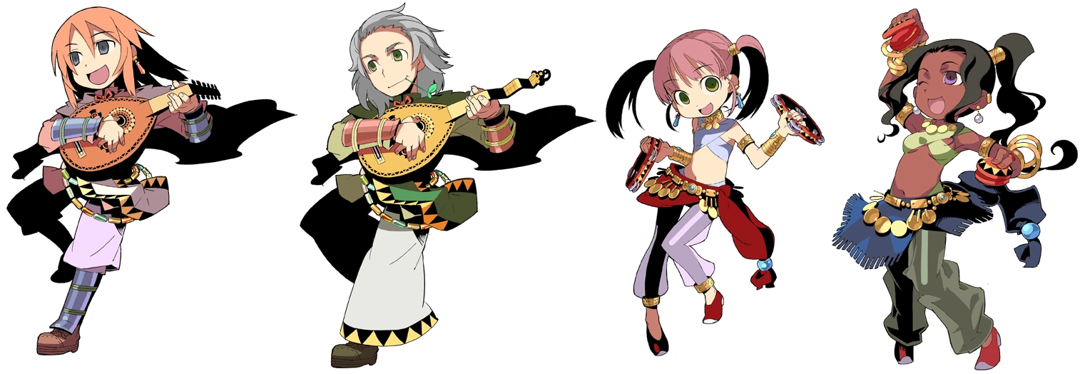 The Troubadour (バード Bard in the Japanese version) are musical prodigies, utilizing song and dance to empower their allies in combat or sapping the enemy's defenses. Though lacking in specific melee prowess, they serve as a jack-of-all-trades, excelling in none but being decent in all, making them utilitile on either line. However, due to their low health and defense, the back line is the most ideal for these performers.